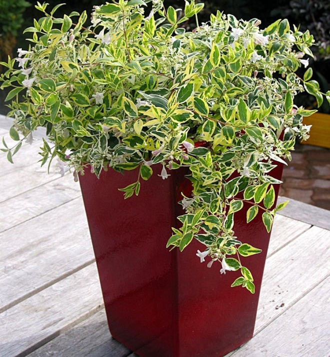 Hopleys высотой до 180 см является красивым, пестролистным и простым в уходе гибридом двух сортов семейства жимолостных – Абелии одноцветковой и китайской. Для кустарника характерна густая крона из длинных ветвей, усыпанных сидячими широколанцетными листьями, и ароматные соцветия воронковидных белых цветов. Цветет с первых месяцев весны до начала осени.