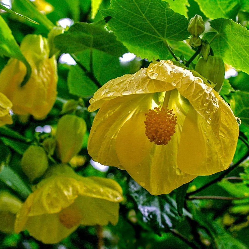 Abutilon Canary Bird - вечнозеленый кустарник до 3 м в высоту с кленовыми листьями. Цветки колоколообразной формы, лимонно-желтого цвета, размером 6 см в длину, цветут в течение длительного периода начиная с весны. Жилкование лепестков едва заметно. Растение лучше цветет и растет в солнечном месте