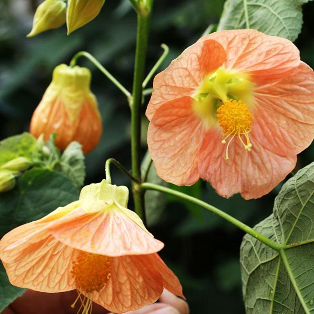 Abutilon Franzi - экзотический кустарник высотой до 40 см. Сорт прекрасно ветвится и формируется в среднерослое растение. Листья темно-зеленые крупные, опушенные. Цветки раскрываются до широкого колокола ""юбочкой"". Лепестки лососевые со светлым зевом и прожилками.