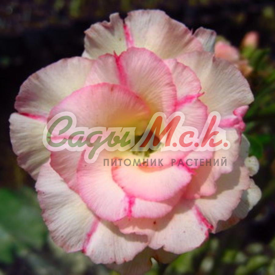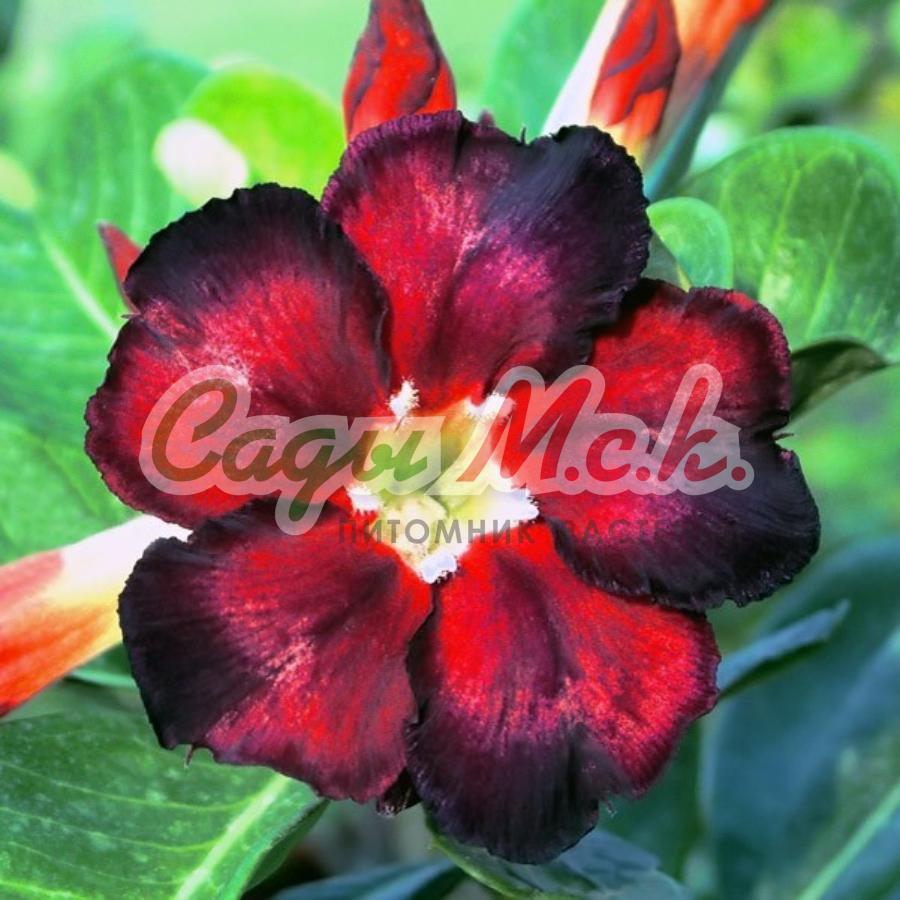 Adenium Hip Hop - небольшое деревце. Ствол мясистый, листья зеленые, огромные. Зацветает сорт в возрасте 1,5-2 года, продолжительность цветения колеблется от 2-3 месяцев до года. Цветки соединяют в себе ярко-красный и темный, почти черный окрасы. Глаз цветка белый с желтым оттенком.