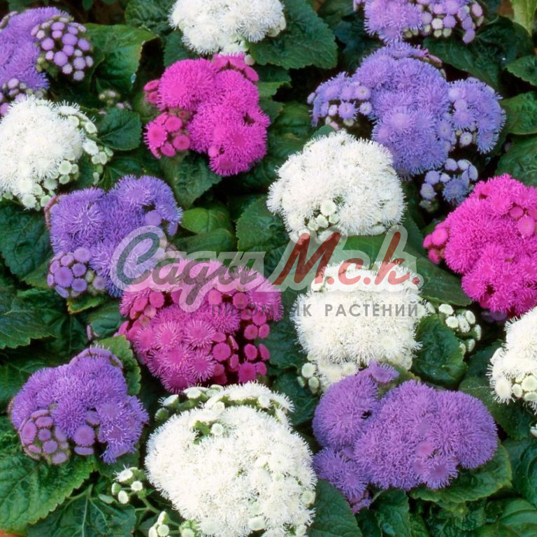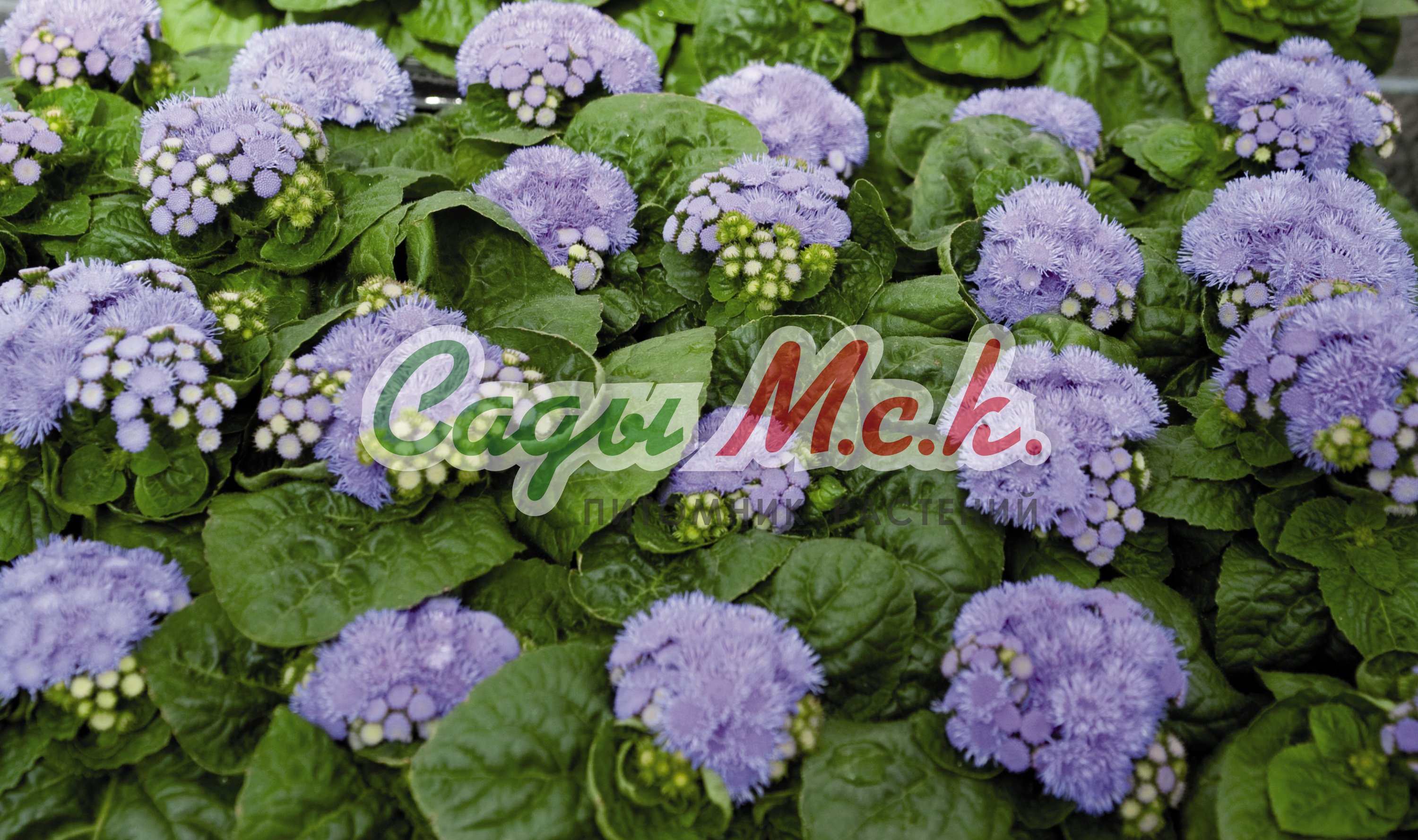 Очень красивая и длительно цветущая смесь сортов с большими пушистыми шапками соцветий. Растения из семейства Астровые, высотой 20-25 см. Цветение обильное с июня до заморозков. Соцветия мелкие, душистые, до 1-1,5 см, собраны в более крупные щитковидные соцветия до 8-10 см в поперечнике. Окраска разнообразная. Агератум засухоустойчив, светолюбив, но может расти при небольшом затенении, предпочитает легкие, умеренно плодородные почвы. Теплолюбив, заморозков не переносит. Используют на клумбах, в рабатках, миксбордерах, агератумами украшают балконы.