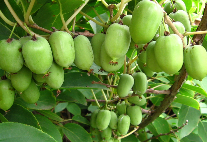 Актинидия Киевская гибридная - ягода до 18 г, по вкусу напоминает киви с вкусными, нежными, ароматными плодами, по цвету от светло-зеленого до темно-зеленого. Мякоть нежная, сладкая, красноватая вокруг семян и у основания плодоножки. Срок созревания ранний, в начале сентября. Начало плодоношения на 3 год. Урожайность 5-10 кг/куст. Лиана до 8 м, растение двудомное, зимостойкое. Листья крупные, овально-эллиптические, побеги серые, с многочисленными белыми точками. Ягоды могут дозревать при хранении.