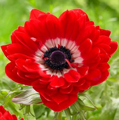 Анемона Говернор рубиново-красного оттенка, у основания лепестков нежно-белая кайма с черными густыми тычинками. Листья рассеченные, пышные, высота куста 15-30 см, диаметр цветка до 8 см.