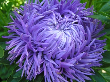 Астра в переводе с греческого значит «звезда», по форме цветы действительно напоминают это небесное тело. Крупные тёмные фиолетово-синие цветки, диаметром 10-12 см, с густыми махровыми лепестками, собранными в центре, напоминают сияющую звезду.
