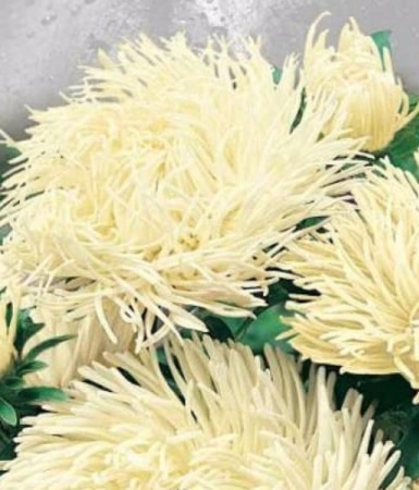 Сортотип – коготковая, среднего срока цветения. Куст колонновидный, высотой 65-75см, формирует несколько упругих прочных цветоносов. Соцветия плотные, махровые, чистой белой окраски, диаметром 10-12 см, состоят из длинных, немного закрученных по длине в тонкие трубки и красиво завитых по спирали язычковых цветков, закрывающих небольшой диск из мелких желтых трубчатых цветков. Астры этой серии великолепны для групповых посадок и срезки.