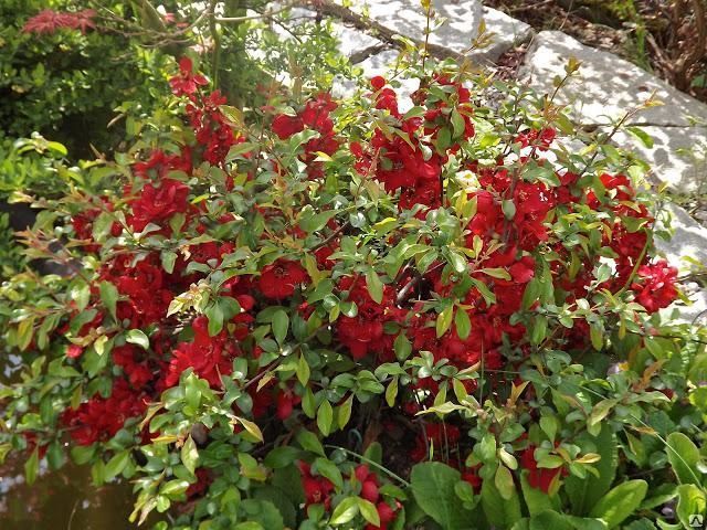 Айва японская Nicoline – невысокий декоративный раскидистый куст с многочисленными красными цветками и зелеными овальными плодами, которые, созревая, становятся ярко-желтыми. Красивые цветы насыщенного оттенка диаметром 4-4,5 см появляются с определенной периодичностью в мае – растение радует ранним и весьма продолжительным цветением.