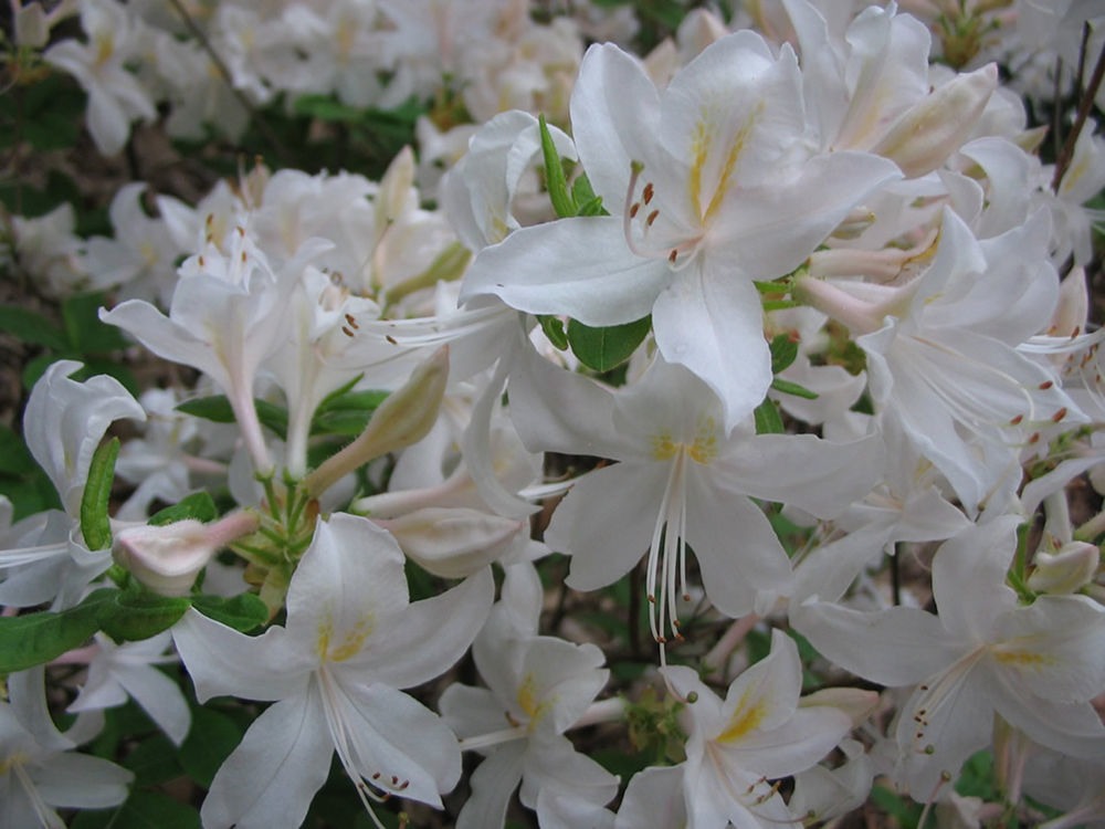 Азалия(рододендрон листопадный) White Lights - листопадный кустарник, высотой до 1,5 метров. Цветёт в мае, июне. В начале цветения имеет лёгкий малиновый оттенок, потом становится белым.