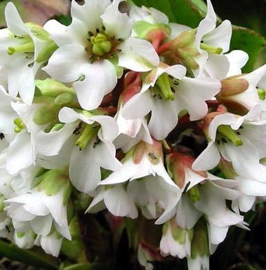 Бадан сердцелистный Джель - компактный, вечнозеленый многолетник с овальными кожистыми, волнистыми, темно-зелеными листьями, краснеющими зимой, и прямостоячими красными стеблями с плотными гроздьями раскрытых колоколообразных белых цветов.