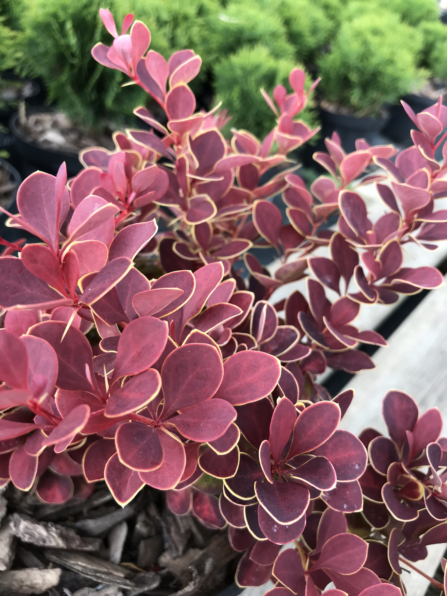 Листья овальной формы, кроваво-красные с тонкой золотистой каймой по краю, осенью – бордово-красные, на солнце более яркие. Рекомендуется высаживать перед кустарниками с тёмно-зелёной листвой