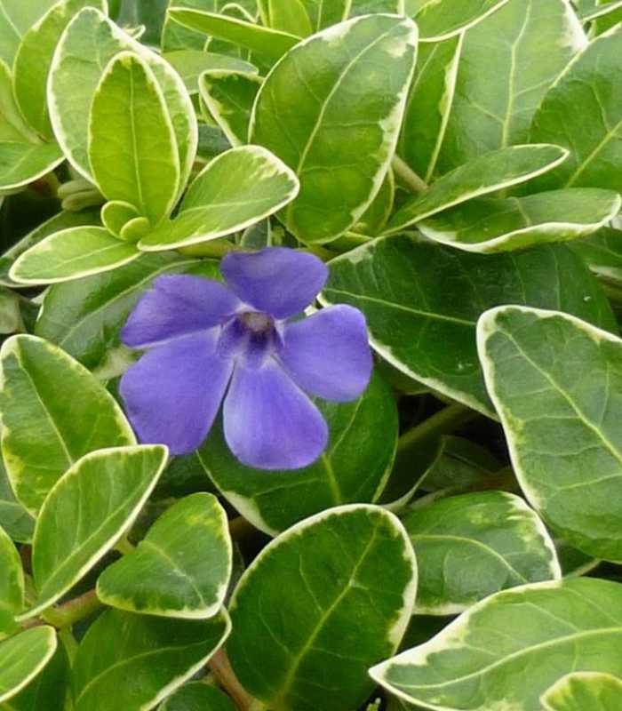 Отличный почвопокровный ползучий полукустарник для тенистых мест, h=10-15 см, хорошо растёт под деревьями, покрывая землю сплошным плотным ковром, может использоваться для укрепления склонов и как ампельное растение для подпорной стенки, стебли ветвистые, длиной до 60 см, концы побегов легко укореняются, цветки светло-фиолетово-голубые, цветёт в мае-июне, листья кожистые, блестящие, тёмно-зелёные с кремово-белыми краями, зона 4 (до -29°С).