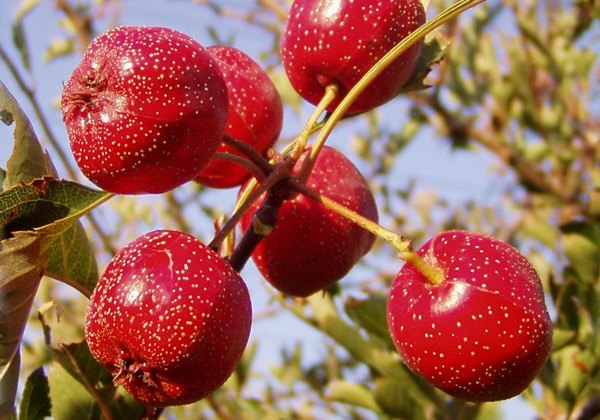 Боярышник сорт Mao Mao - побеги прямые, коричневые, с крупными беловатыми чечевичками, почти без колючек. Листья яйцевидные, 5–7-лопастные, голые. Плоды шаровидные до яйцевидно-шаровидных, 2–2,5 см в диаметре, ярко-красные, с крупными белыми бородавками, массой 10 (12) г. Мякоть желтоватая, кислая. Плоды созревают в конце сентябре – начале октября. Достоинства – крупные плоды, небольшое количество колючек.