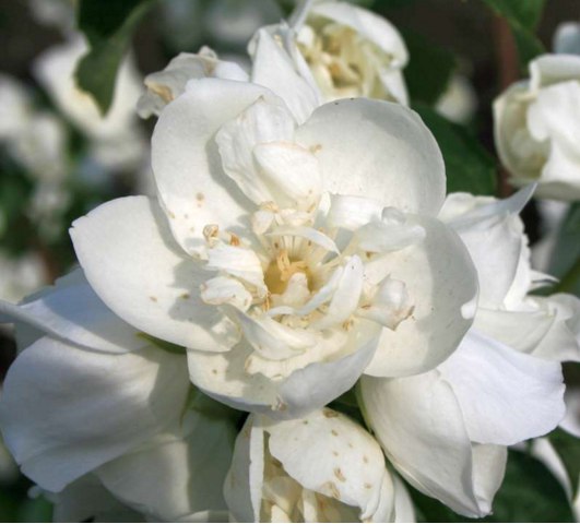 Чубушник Pearls - куст очень яркий, красивый, невысокий, с пурпурными побегами. Листья сочно-зеленые. Цветение обильное и продолжительное, со второй декады июня. Цветки огромные (до 6 см), белые, с перламутровым блеском, густомахровые, с многочисленными лепестками. Излучают легкий аромат ванили.
