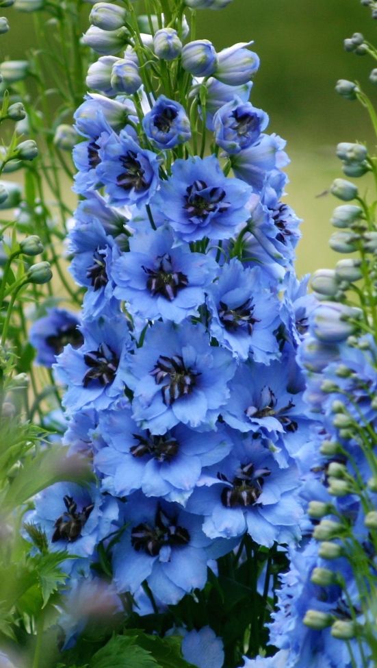 Дельфиниум высокий Делфис Сикрет^ Цветки крупные, махровые, темно-синего цвета с легкими лиловыми размывами и мохнатым черным центром; собраны в колосовидное соцветие высотой 50-60 см. Куст с прямостоячими мощными побегами, высотой до 100 см. Цветёт обильно с июня по июль, повторно в сентябре, при условии обрезки цветоносов после первой волны цветения.