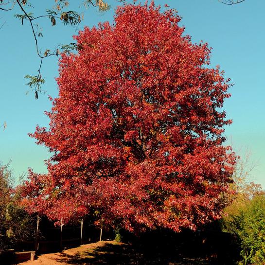 Стройное, изящное дерево, до 25 м в высоту, с густой шатровидной кроной. Ствол покрыт гладкой, тонкой, серой корой, растрескивающейся у старых деревьев. Побеги молодые рыжевато-войлочные, однолетние – гладкие, красно-бурые. Глубоковыемчатые листья, блестящие, тонкие, до 15-20 см, с 4-5 заостренными лопастями с каждой стороны листа, при распускании слегка красноватые, а летом золотист-зеленые, к низу светлее. Осенью, перед листопадом у молодых деревьев — шарлахово-красные, у деревьев почтительного возраста — буровато-коричневые