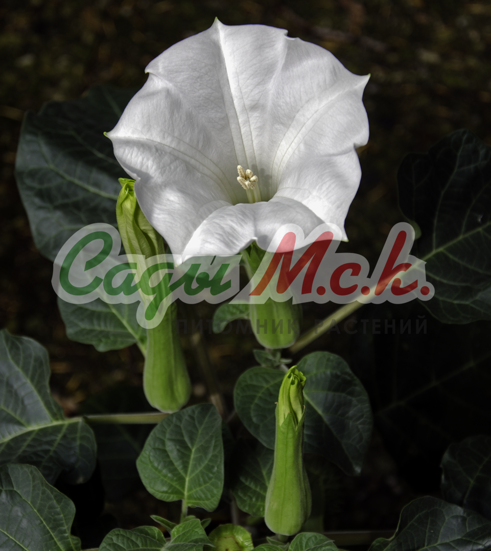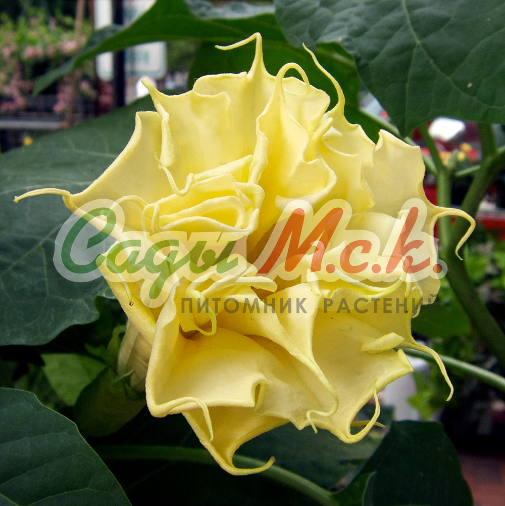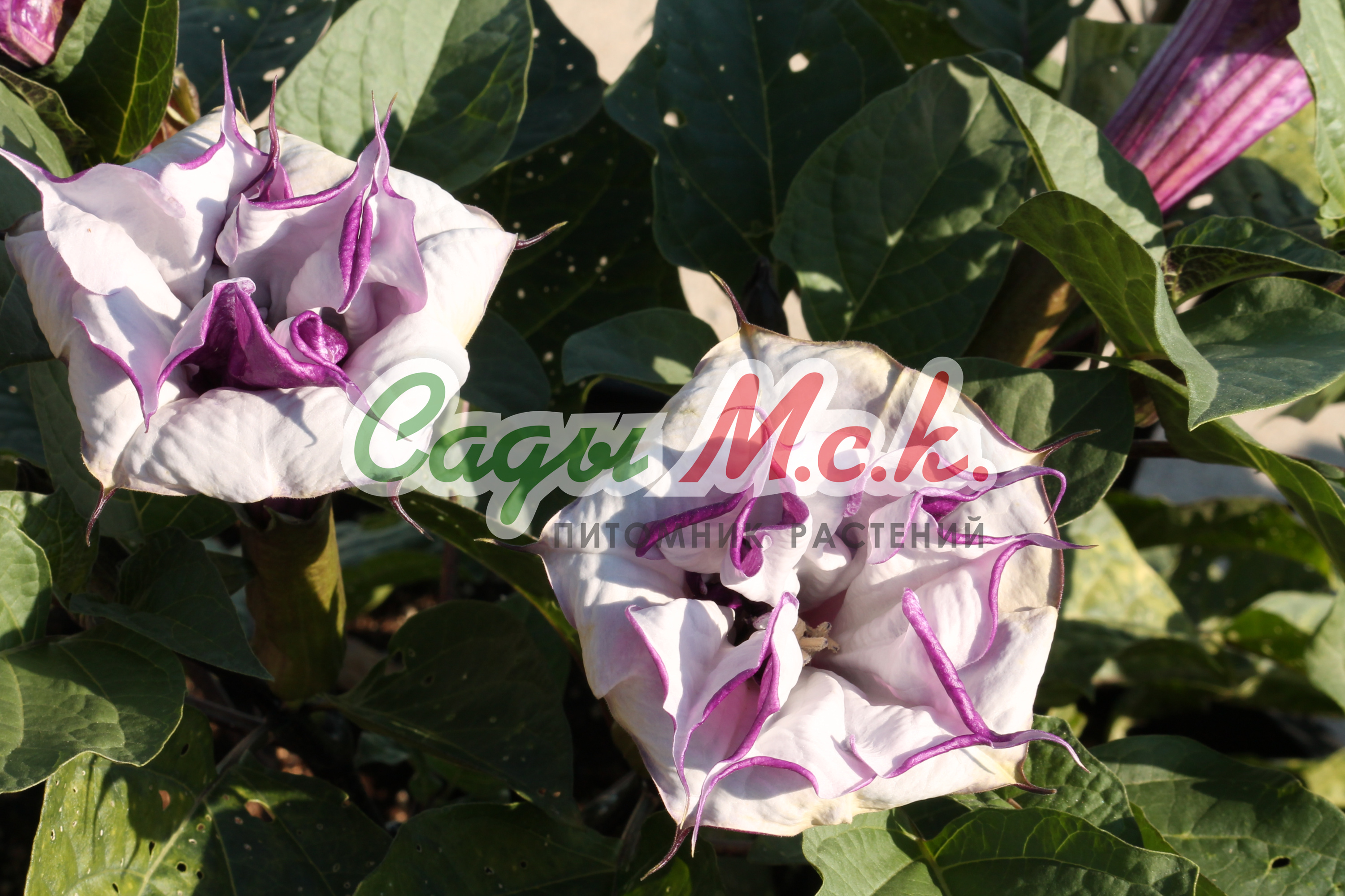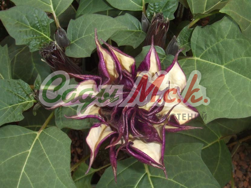 Раннецветущий компактный сорт (высота куста до 50 см) Цветки трубчатой формы, крупные, махровые, диаметром до 10 см, длиной до 20 см, бело-кремовой, золотисто-жёлтой, сиренево-пурпурной окраски. Ежедневно на каждом кусте распускается до 12 огромных, ароматных цветков. Листья черешковые, крупные, со слегка волнистым краем. Плоды – колючие коробочки с большим количеством крупных семян. Листья, стебли, цветки и корни дурмана ядовиты. Растение тепло- и светолюбивое. Семена высевают в марте-апреле на рассаду или прямо в открытый грунт в мае на глубину не более 0,5 см. Семена довольно медленно всходят (при температуре +20…+22 градуса они прорастают 2 недели). При пересадке датуры в грунт нельзя заглублять корневую шейку. Уход заключается в обильных поливах и подкормках. Для стимуляции цветения необходимо каждые 1-2 дня удалять отцветшие цветки с образовавшимися завязями. Дурман можно выращивать в качестве многолетней кадочной культуры.