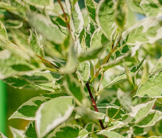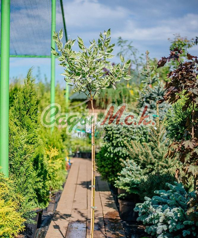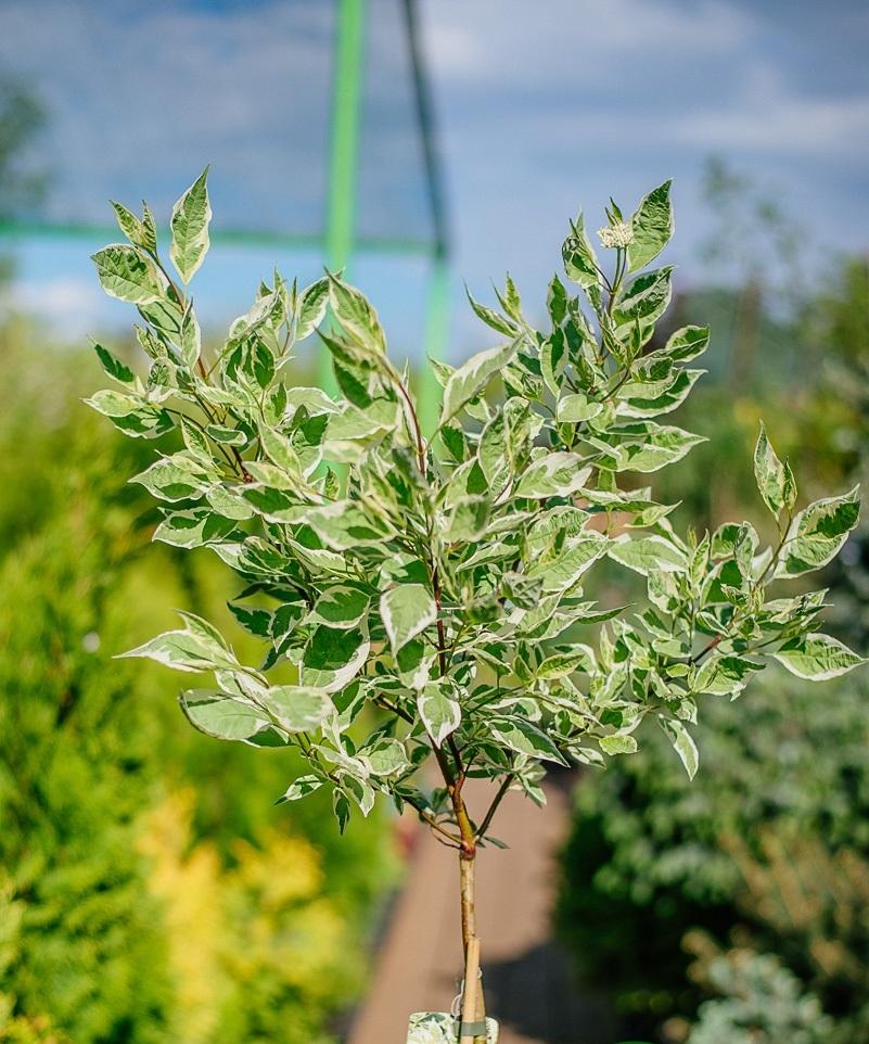 Кустарник привитый на штамб 120-140 см, ширина кроны может достигать в диаметре 150-200см., с тонкими, гибкими, кораллово-красными или красно-бурыми, направленными вверх ветвями. Листья яйцевидные, длиной 4-8 см, заостренные, серо-зеленого цвета с неравномерной кремово-белой каймой, осенью фиолетово-красные. Похож на сорт дерена белого Sibirica Variegata, но куст более крупный. Цветет в июне, в течение 15-20 дней, желто-белыми мелкими цветками, собранными в плотные полушаровидных соцветиях, диаметром до 5см. Растет быстро, до 50 см в год. Зимой декоративно смотрятся красные побеги на фоне белого снега. Быстро отрастает, переносит обрезку, идеально подходит для живых изгородей. Хорошо переносит морозные зимы