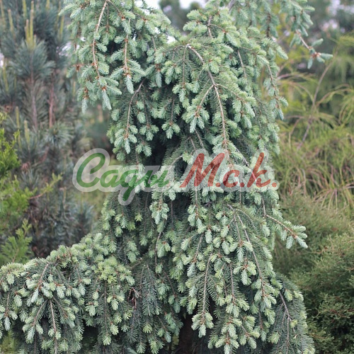 Ель колючая Glauca Pendula отличается необычной формой кроны с плакучими ветвями и голубой хвоей. Растет довольно быстро до 30 см в год. Высота дерева зависит от высоты, на которую произведена прививка и формирования ведущего побега. Высота взрослого растения может быть до 8-10 м. Ветви довольно жесткие, образуют эффект каскада, густо покрывают ствол. Нижние ветви низко расположены, практически лежат на земле, плакучие. Хвоя жесткая, плотная, голубовато-зеленая, 1,5-2,0 см, расположена радиально. Красивая голубая окраска хвои сохраняется в течение всего года при посадке на солнечном месте.