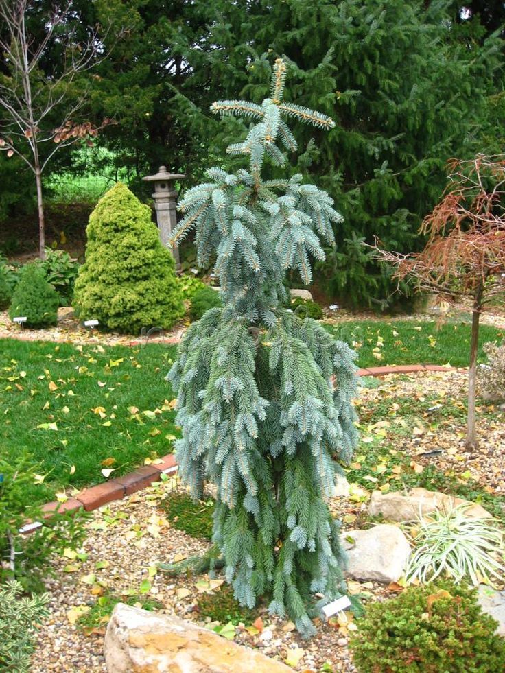 Ель колючая Глаука Пендула - отличается необычной формой кроны с плакучими ветвями и голубой хвоей. Растет довольно быстро до 30 см в год. Высота дерева зависит от высоты, на которую произведена прививка и формирования ведущего побега. Высота взрослого растения может быть до 8-10 м. Ветви довольно жесткие, образуют эффект каскада, густо покрывают ствол. Нижние ветви низко расположены, практически лежат на земле, плакучие. Хвоя жесткая, плотная, голубовато-зеленая, 1,5-2,0 см, расположена радиально. Красивая голубая окраска хвои сохраняется в течение всего года при посадке на солнечном месте.