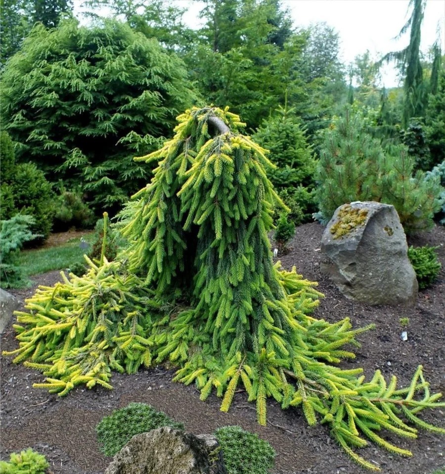 Плакучее растение. В 10 лет высота составляет 1,5 м. Годовой прирост - не более 10 см. Молодой прирост цвета лайм, затем становится золотисто-желтым. Этот цвет сохраняется до следущего года, пока не отрастут новые побеги. Можно вести, подвязывая центральный проводник — и получить довольно высокое плакучее деревце, а можно выращивать как почвопокровную ель. Размер взрослого растения (в 25- 30 лет): зависит от способа ведения кроны. Очень декоративна.