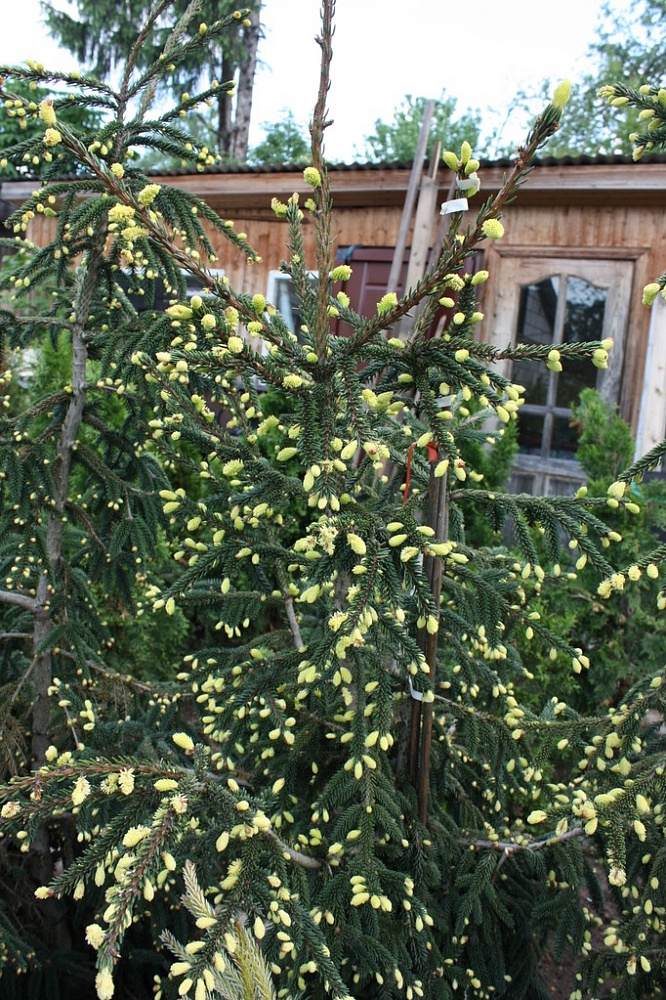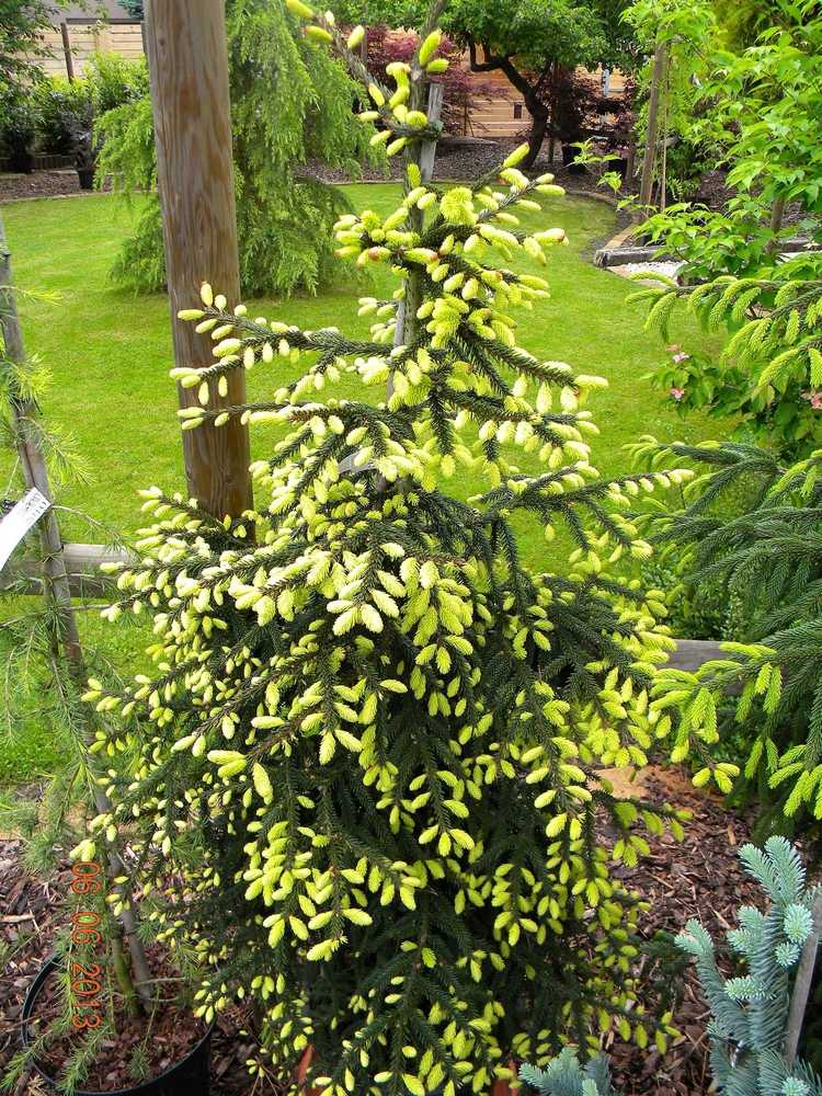 Ель восточная Aureospicata - хвойное вечнозеленое дерево конической формы. Крона плотная. Взрослая ель может достигать высоты 8-12 м и ширины 5 м. В возрасте 30 лет достигает 6-8 м высоты. В 10 лет высота около 2,5 м и 1,5 м в диаметре. Сорт является самым декоративным представителем елей восточных благодаря ярко-желтым молодым приростам, которые появляются позднее чем у других сортов ели, в июне мясяце. Вырастая, приросты становятся зелеными. Хвоя короткая, темно-зеленая, блестящая. Иголки короткие, жесткие.