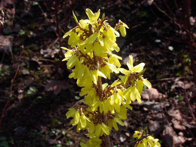 Форзиция Densiflora - сорт форсайтии промежуточной. Листопадный кустарник до 2,5 м высоты. Крона до 3 м диаметром, широкораскидистая, с дуговидно изогнутыми ветвями. Листья яйцевидно-ланцетные, летом нежно зеленые, осенью ярко окрашенные. Цветки до 4,5 см диаметром, палево-желтые, расположенные в густых, плотно скученных на побегах пучках, с широко распростертыми, плоскими или загнутыми долями отгиба.