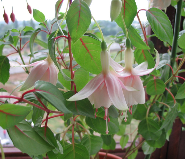 Фуксия Annabel- кустовая форма. Чашелистики белые с зеленоватыми кончиками, слегка розовеющие на свету. Юбочка белая махровая, с легким розовым излучением в основании.