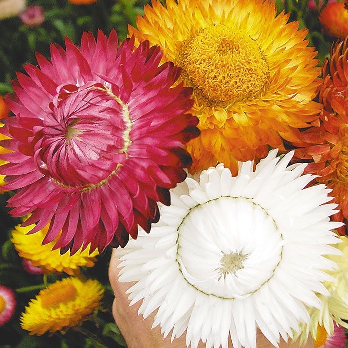 Гелихризиум Королевский размер - смесь окрасок высокорослых сортов популярных сухоцветов. Мощные ветвистые растения достигают 1 метра в высоту и образуют многочисленные крупные цветки с корзинками до 8 см в диаметре, плотно окруженными сухими чешуйками-лепестками. Великолепно смотрятся в миксбордерах в сочетании со злаками, сохраняя декоративность с июля и до заморозков. Для зимних букетов цветоносы срезают в фазе неполного раскрытия бутона и высушивают, подвешивая вниз головками. Семена на рассаду высевают в марте в ящики или в мае прямо в грунт.