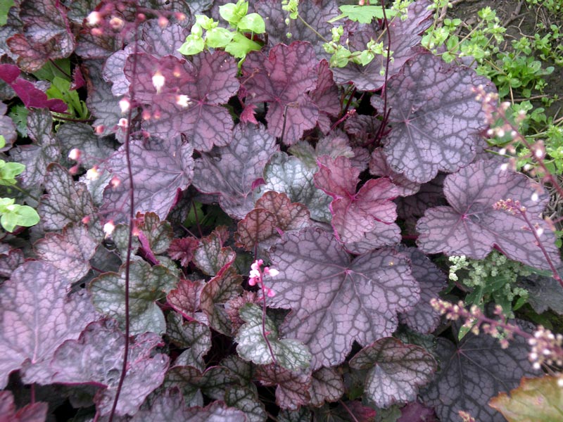 Гейхера Cascade Dawn - сорт, который сильно меняет окраску листвы. Молодой лист имеет малиново-пурпурные оттенки на слегка проступающем зеленоватом фоне и темно коричневые (зеленовато-коричневые) прожилки. Со временем малиново-пурпурные тона уходят и вместо них появляются контрастные светло серебристые пятна на холодном темно зеленом с примесью пурпурных оттенков фоне. Листва отлично смотрится весь сезон.