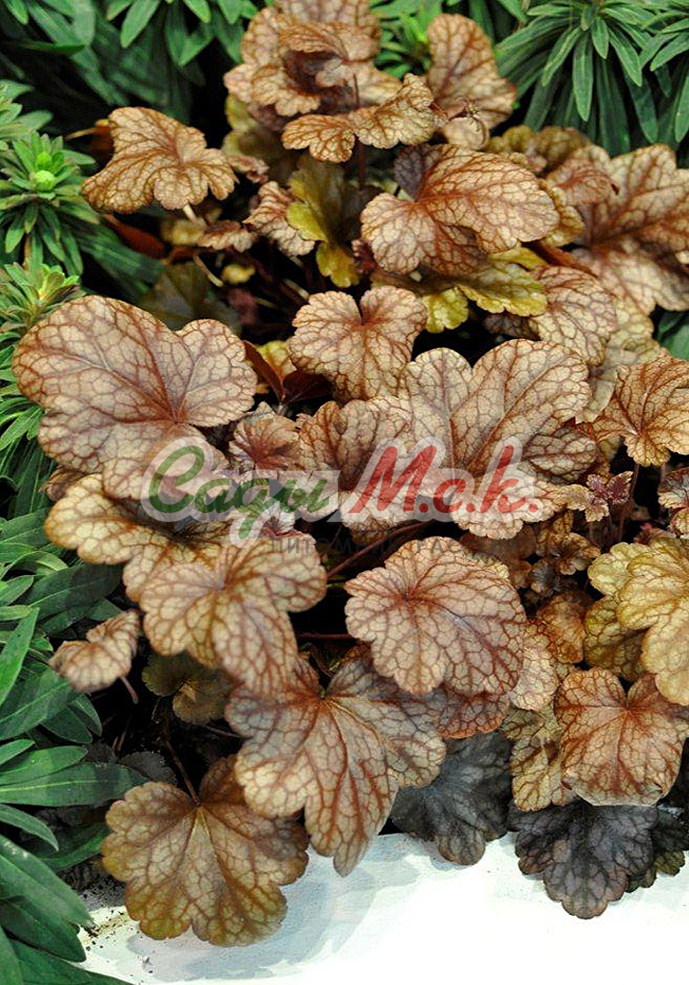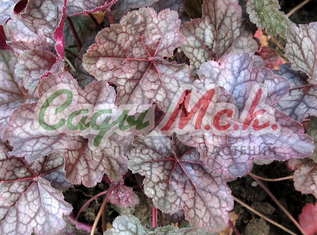 Гейхера GLITTER - новый сорт. Куст очень плотный. Листва серебряного цвета, с акцентированными черными прожилками. Серебряные листья контрастируют с лавандового цвета изнанкой. Высота растения 25 см, с соцветием достигает 40 см. Ширина куста 35 см. Эта гейхера имеет фантастический букет экзотических цветов типа фуксии - розового оттенка . Цветет очень обильно и красиво с июня по сентябрь.