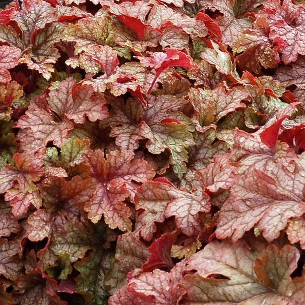Гейхера Honey Rose удивительна фантастическим изменением цвета - от коралла весной до бронзового летом. Темные прожилки и затейливые узоры добавлят великолепия глубоко надрезанной листве. Белые цветы цветут на коротких черешках летом. Растение компактного размера: высота 20 см, ширина 33 см, цветоносы - 30 см.