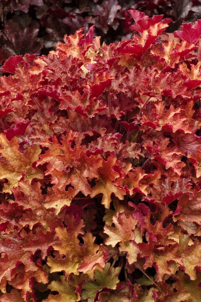 Гейхера PEACH PARFAIT - куст высотой 30 см и диаметром 40 см. Листва красивая, в персиково-розовых тонах. В более холодное время покрывается серебряным рисунком. Этот сорт предпочитает расти в тени.
