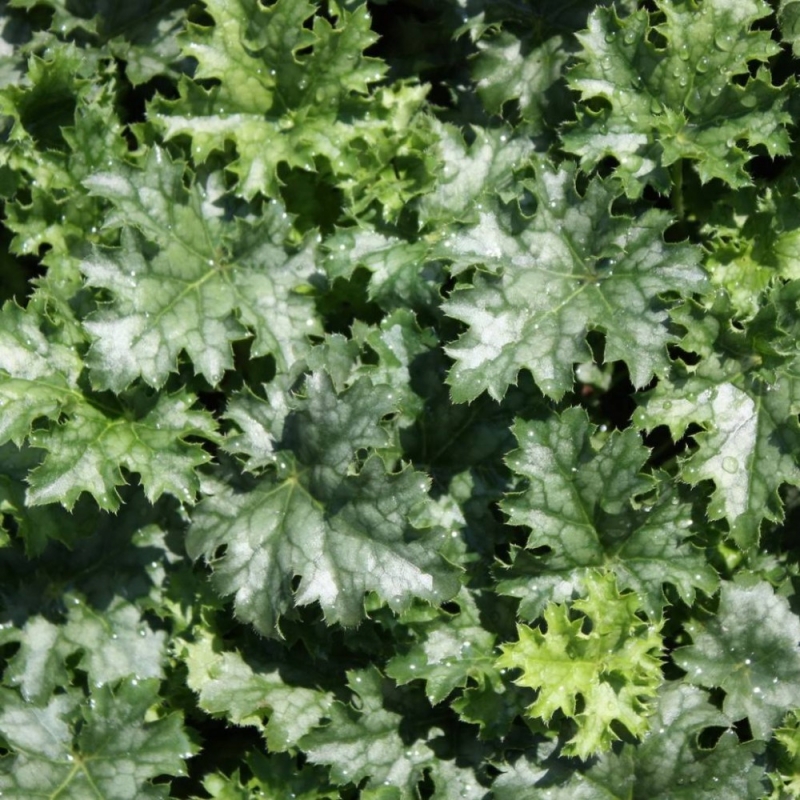 Гейхера Mаlасhitе относится к американским сортам. Весьма декоративный, крупный травянистый многолетник с сильно волнистыми листьями ярко-зеленого, малахитового цвета. Декоративность имеет не только яркая окраска, но и форма листьев, собранных в розетки. Ажурные, пяти или девятилопастные, зубчатые, они образуют весьма декоративные кустики высотой до 50 см. Изумрудная зелень оттеняется мелкими, собранными в ажурные соцветия цветками. Растение используется для создания декоративных пятен на бордюрах или для срезки. Сорт «Малахит» засухоустойчив и зимостоек, но предпочитает дренированную почву и открытые солнечные участки.