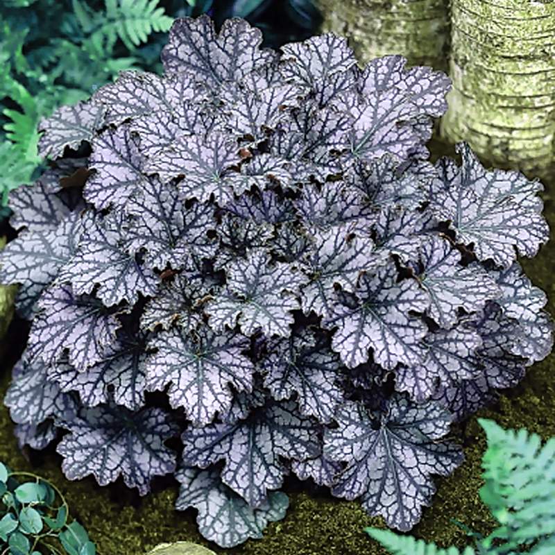Гейхера Nерtunе относится к сильным, выносливым и неприхотливым почвопокровным растениям. Ее ажурные, слегка волнистые по краю листья на длинных черешках слегка загнуты наружу и расположены практически параллельно земле. Это дает очень плотный, слегка волнистый куст подушковидной формы. Цвет листвы невозможно определить однозначно: темно-фиолетовые пластины с лавандовым оттенком украшены темно-зеленым, не слишком ярким узором жилок и крупными серебристо-серыми пятнами. Молодые кустики серебристые. Благородно и изысканно на их фоне выглядят бело-розовые цветки, мелкие, на высоких цветоносах, собранные в ажурные метелки. Такое растение смотрится броско и эффектно и, без сомнения, станет самым ценным приобретением любой коллекции.