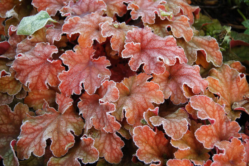 Гейхера Peach Flambe – новый сорт многолетних растений семейства камнеломковых. Его изумительная листва, играющая всеми оттенками красного, буквально светится весь период вегетации. Весной она поражает красно-оранжевым окрасом листьев, которые летом сменяет на персиковый тон, а осенью изумляет богатством сливовых оттенков. На молодых растениях четко виден серебристый рисунок, который со временем бледнеет, но вновь проявляется в осеннее время. Крупные, гладкие листья собраны в аккуратные розетки, достигающие высоты 20–25 см. В начале лета растение выбрасывает мелкие белые цветы на высоких цветоносах. Чтобы сохранить декоративность куста и не допустить солнечных ожогов, важно правильно подобрать место посадки. Сорт больше любит полутенистые участки, с хорошим дренажем и богатой почвой.