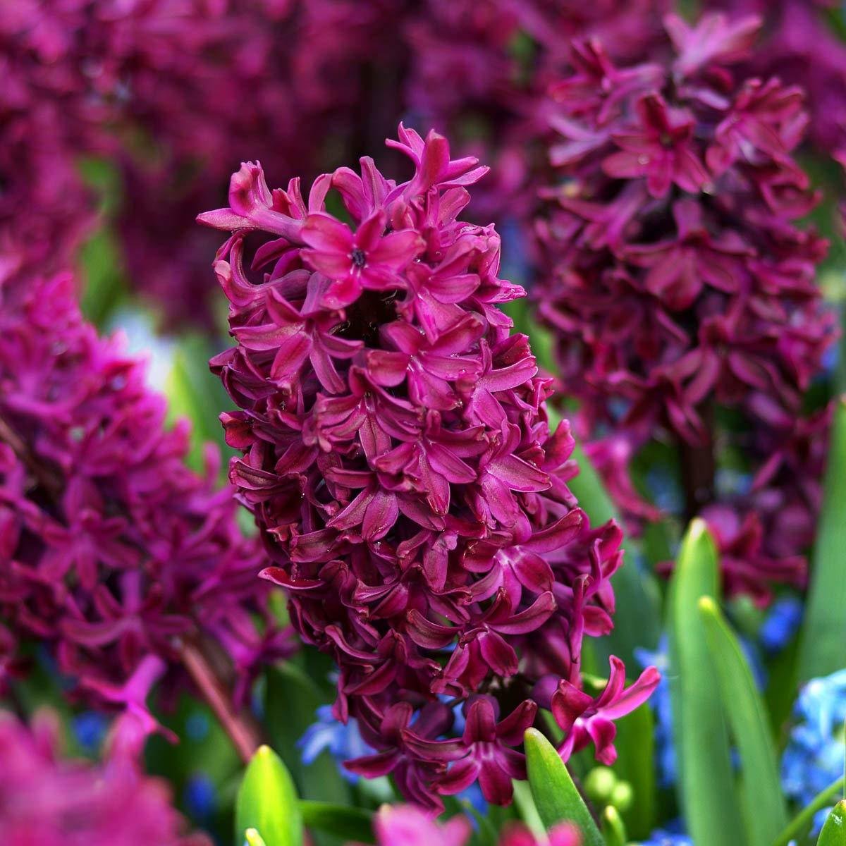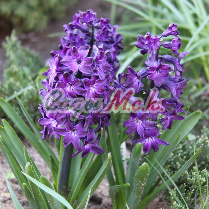 Гиацинт Шоумастер - цветки крупные, собранные в пышные соцветия, ярко-лиловый с бронзовым стеблем. Растение невысокое, стебель прямостоячий, крепкий. Гиацинты получили огромную популярность из-за своей привлекательности, их выращивают в горшках в домашних условиях, в открытом грунте на клумбах, а также в воде.