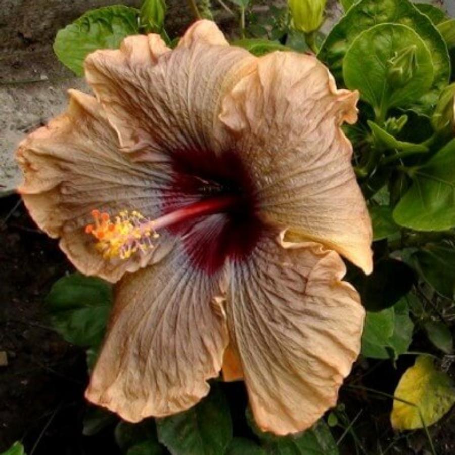 Гибискус Cloudy Days обладает простыми серовато-коричневыми цветками с широкой светло-бежевой каймой по краю лепестков.