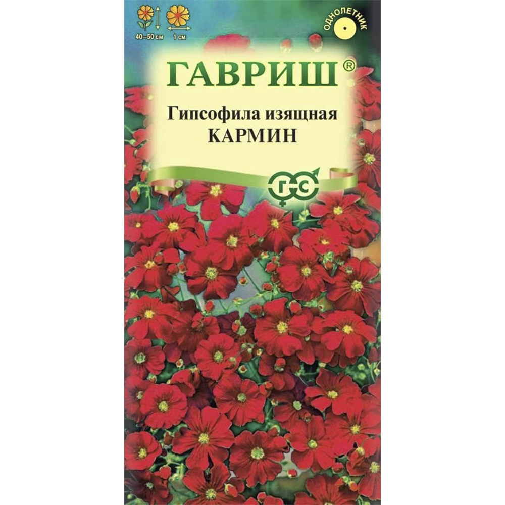 Неприхотливое растение семейства Гвоздичные с тонкими сильноветвящимися побегами высотой 40-50 см, образующими ажурный кустик. Для получения цветущих растений в течение всего лета посев можно проводить в несколько сроков с интервалом 1,5-2 недели (гипсофила зацветает через 1,5 месяца после посева). Цветет очень обильно в июне-июле, около трех недель. Карминно-красные мелкие цветки (диаметром до 1 см) собраны в рыхлые широкие соцветия. Холодостойка, светолюбива и достаточно засухоустойчива, предпочитает легкие некислые почвы. Выращивают прямым посевом в грунт в начале мая или под зиму. Всходы появляются через 8-10 дней после посева, их прореживают с расстоянием между растениями 15 см. Используется для посадки в миксбордерах, альпинариях, бордюрах и рабатках и получения срезки (для аранжировки букетов).