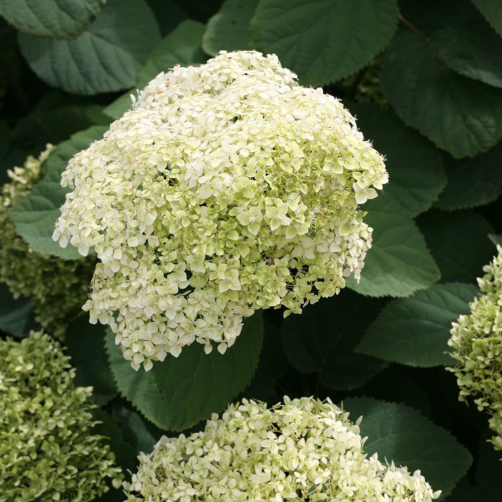 Гортензия древовидная (Hydrangea arborescens `Lime Rickey`). Описание: Кустарник с крепкими ветками, не разваливается под тяжестью своих соцветий. Высота куста 0,8–1,2 м, а диаметр 0,7–0,9 м. Соцветия до 20–25 см в диаметре.