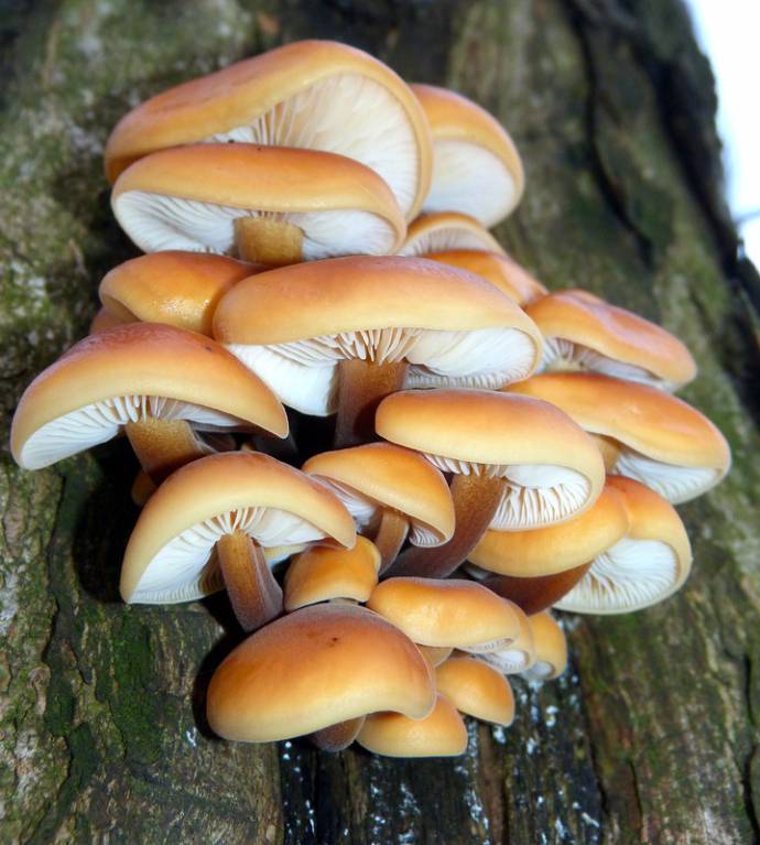 Гриб Опёнок Зимний - шляпка зимнего опенка 2-10 см в диаметре, гладкая, голая, слизистая до слабоклейкой, желто-коричневая с ржаво-оранжевым центром и с прозрачно-полосатым краем, плоскоокруглая. Край шляпки в молодости завернут внутрь, с возрастом он расправляется. Примечательно, что зимний гриб в зависимости от дерева, на котором он паразитирует, может образовывать интересные цветовые формы. Фламмулина имеет пластинки, слегка приросшие к ножке или свободные, белые до светло-охряных, с характерными маленькими перемычками. Мякоть шляпки довольно толстая, желтоватая или кремовая, с мягким вкусом и приятным грибным запахом. Ножка 5-10 X 0,3-1 см, цилиндрическая, сверху иногда уплощенная, упругая, плотная, в основании темно-коричневая и бархатистая.