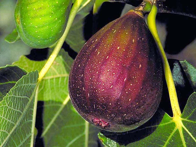 Саженцы инжира Brown Turkey принадлежат к урожайным сортам. Дерево рослое, скороплодное, формирует соплодия грушевидной формы. Плод крупный, удлиненной формы, зеленовато-розового оттенка с темными ребрами, на солнце цвет становится коричнево-фиолетовым. Мякоть очень сочная, желтого оттенка, сладкая, приятная на вкус, обладает вполне гармоничной кислинкой. Крупномер инжира Brown Turkey относится к самоплодным сортам, урожай можно собирать два раза за год. Первый урожай будет составлять примерно четверть от общего объема. Плодоношение продолжается до заморозков. Плоды не растрескиваются на вершине.
