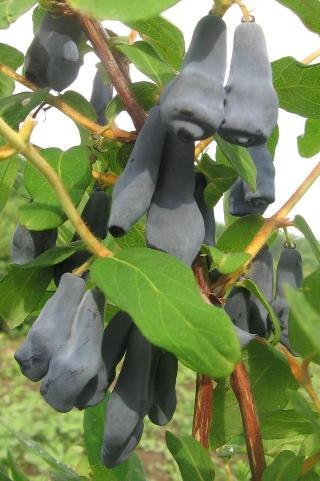 Жимолость Дочь великана - куст высокий, среднеплотный овальный. Однолетние побеги средние прямые, основная окраска зелёная во второй половине лета. Листья средние, зелёные, матовые овальной формы. Ягоды очень крупные, неодномерные (массой от 1,8 до 2,5 г) удлинённо-грушевидной с валиком у верхушки и характерно изогнутой в сторону у основания формы (напоминают перевёрнутую запятую). Они тёмно-фиолетовые с сильным восковым налётом, отчего кажутся сизыми. Вкус десертный, сладкий, ягоды хороши при заморозке. Консистенция мякоти средняя, созревание среднепозднее растянутое. С куста собирается от 3,1 до 3,5 кг.