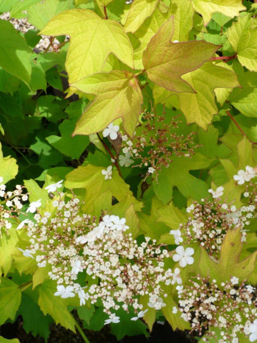 Калина Annys Magic Gold - кустарник высотой 2 метра имеет раскидистую крону шириной 2 метра. Куст покрыт большими листьями светло-зеленого оттенка, которые осенью меняют свой цвет на оранжево-желтый, украшая собой приусадебный участок. Цветение начинается в начале мая, длится в течение 2-х недель и сопровождается появлением кремово-белых мелких цветов, собранных в мощные соцветия-зонтики. Этот сорт калины не дает плодов. Отличается особенно быстрым ростом.