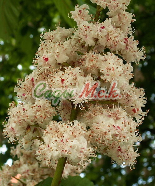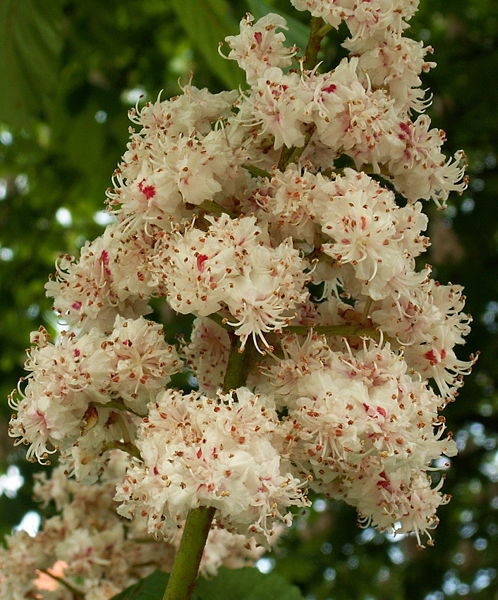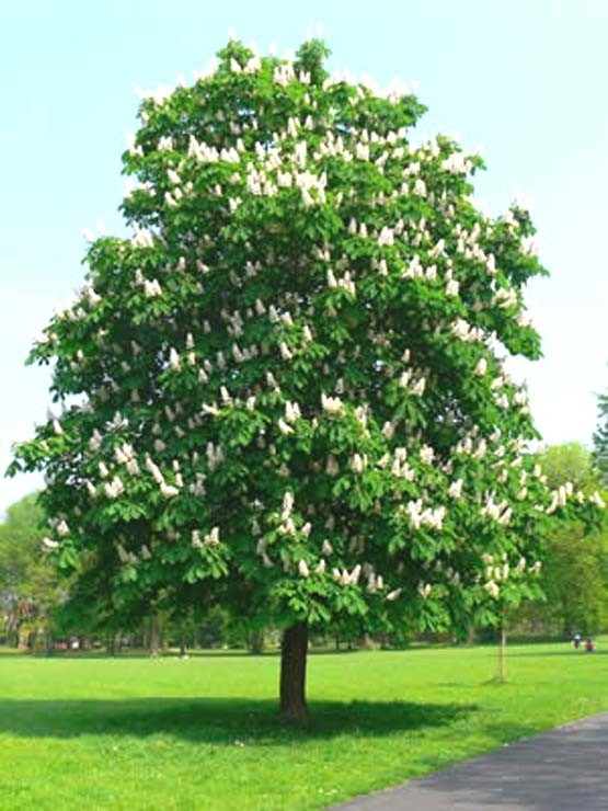 Листопадное дерево с густой широкой кроной. В благоприятных условиях его высота достигает 18–25 метров. Веерообразные листья состоят из пяти или семи продолговатых листочков, по ширине где-то 20–25 см, а цветки, размером до 3 см, собраны в свечи-соцветия, длиной 10–15 см. Каштан цветет чуть более двух недель, а осенью, в сентябре, созревают его плоды – зеленые трехстворчатые шиповатые коробочки, диаметром 6 см, с одним крупным семенем
