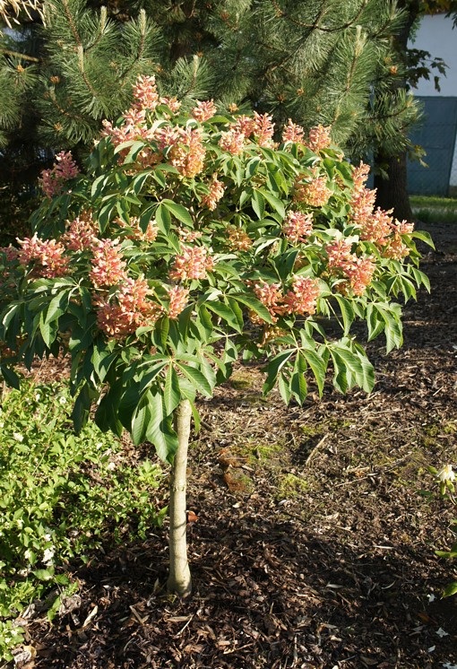 Aesculus mutabilis Penduliflora - еще один гибрид конского каштана карликового между aesculus pavia и aesculus sylvatica. Растет в форме небольшого кустарника или небольшого деревца. Габитус куполовидный, компактный; цветки двухцветные, желто-розовые. Растение с более мелкими, чем характерно для каштана, листьями. Карликовое дерево, растущие в 1-2 м высотой. Использование: отлично смотрится в любых композициях и неплохо проявит себя в роли солитера. Цветение май-июнь. Морозостойкость до -29 ° C