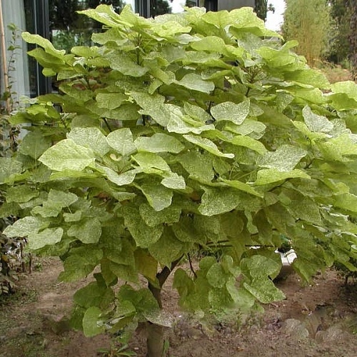 Самый уникальный сорт катальпы. Это небольшое дерево или большой куст. Форма кроны шаровидная. Это потрясающее растение, которое нельзя пропустить в саду. Пестрые листья великолепны и украшают пейзаж. Более того, в качестве бонуса небольшой размер растения означает, что прекрасные белые цветы с пурпурными прожилками находятся на уровне глаз, что позволяет вам наслаждаться ими гораздо больше, чем теми, которые возвышаются над головой у высокорослых видов.
