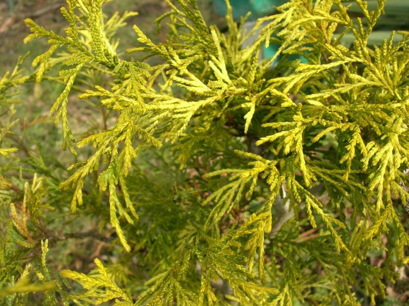Хвоя чешуйчатая, мягкая, золотисто-жёлтая или светло-зелёная, не меняющая окраску в течение года, интенсивность цвета проявляется на молодых побегах и на солнце. Более старая листва приобретает тёмно-зелёный оттенок.
