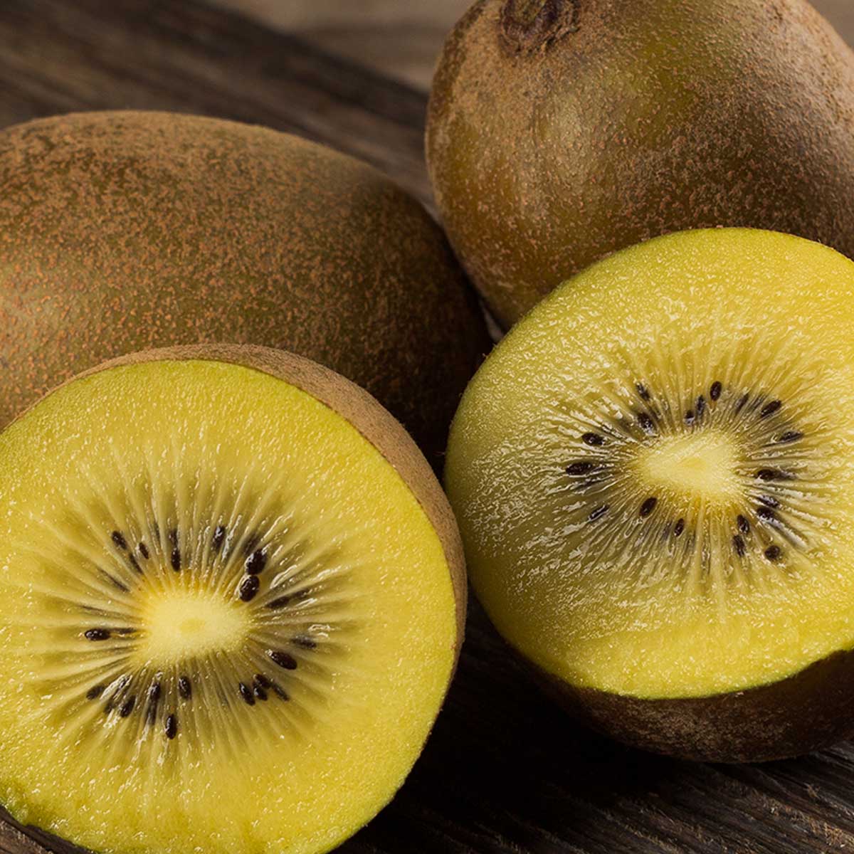 Саженцы Киви Gold kiwi принадлежат к новым урожайным сортам. Растение рослое, зацветает в конце мая, привлекая внимание уникальным ароматом и красотой соцветий. Плод овальной формы, с гладкой зелено-золотистой кожицей с небольшими бугорками. Мякоть обладает тропическим ароматом и легким лимонным вкусом, сочная, сладкая, богатая микроэлементами и витаминами. Саженцы Киви Gold kiwi дают обильный урожай на третий год после прививки. Плоды рекомендуются к употреблению пожилым людям, а так же тем, кто стремиться сохранить стройную фигуру, калорийность всего 100 калорий, мякоть киви способна расщеплять жиры.