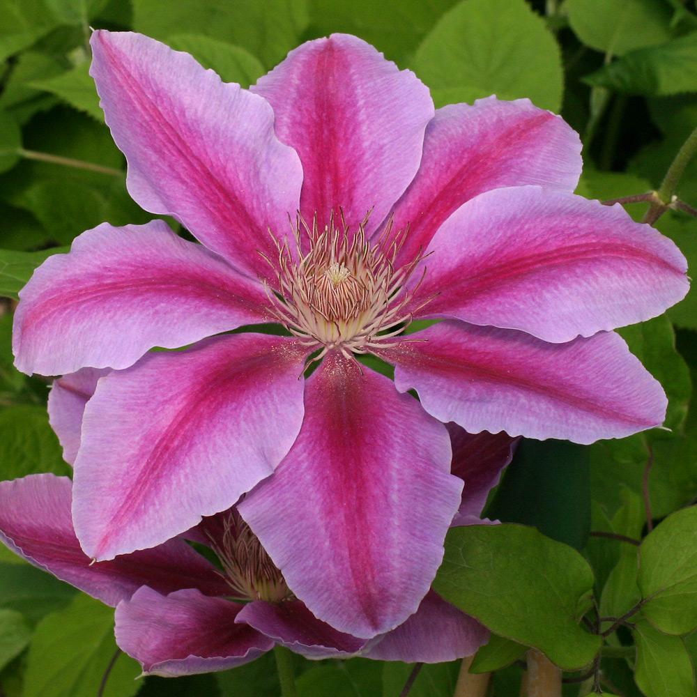 Клематис Bees Jubilee - интересный и необычный сорт клематисов. Его главная особенность заключается в том, что он предпочитает расти в солнечных и полузатененных местах с хорошо дренируемой почвой. Цветки лилово-розовые, с тёмно-розовой полоской и светло-коричневыми пыльниками. Цветут в мае, июне и повторно в сентябре. Диаметр цветка - 15-18 см. Высота куста до 2,5 м, ширина до 1 м.