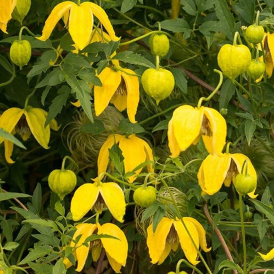 Клематис Bill MacKenzie - прекрасная сильнорастущая лиана с зелёными листьями до ноября месяца. Летом и осенью покрыта массой колокольчиковидных, ярко-жёлтых цветков, осенью также декоративна благодаря пушистым соплодиям. Размер цветка - 6-8 см, высота растения может достигать 600 см. Сорт устойчивый и малотребовательный лиана. Хорошо переносит засуху.