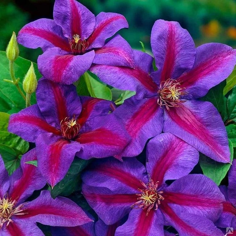 Клематис крупноцветковый Миссис Н.Томпсон относится к сортам знаменитой английской селекции, которые отличаются своим классическим внешним видом и обильным цветением. Подходит для выращивания в контейнере. На прошлогодних побегах образуются крупные цветки с диаметром до 15 сантиметров простой формы, но яркой двухцветной окраской. Основным оттенком у Клематиса крупноцветкового Миссис Н.Томпсон выступает фиолетовый, а посередине каждого лепестка проходит полоса малинового цвета. В течение одного сезона зацветает дважды: сначала в конце весны, повторно ― в конце лета. Предпочитает посадку на солнечном месте с рыхлой нейтральной почвой.